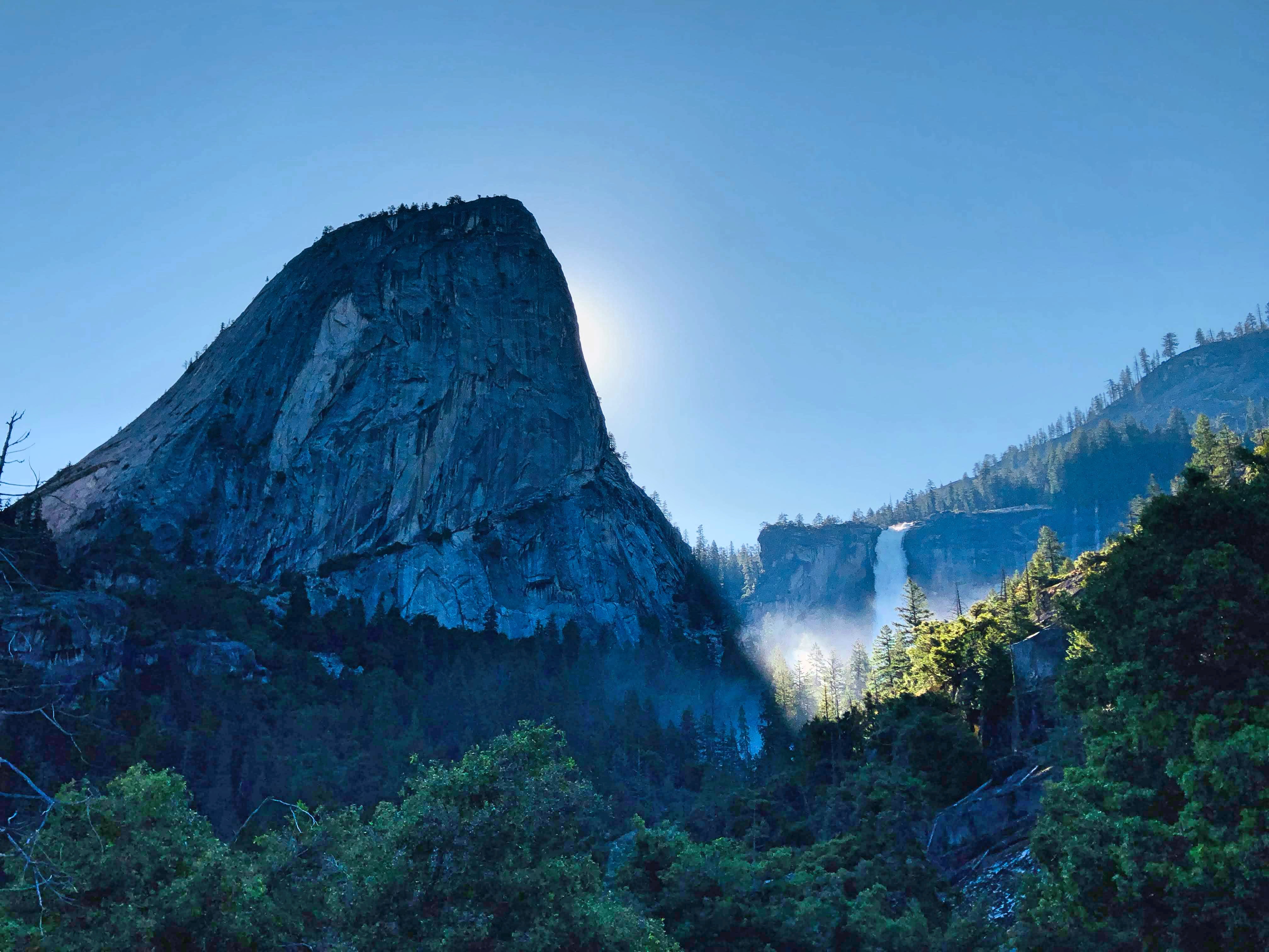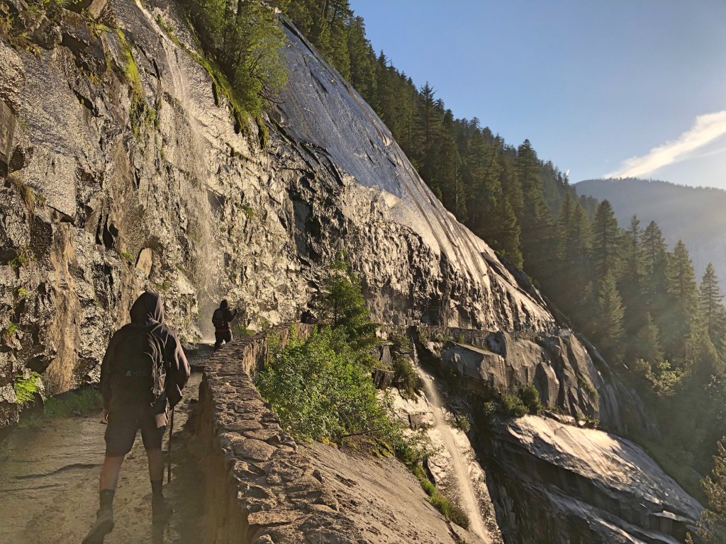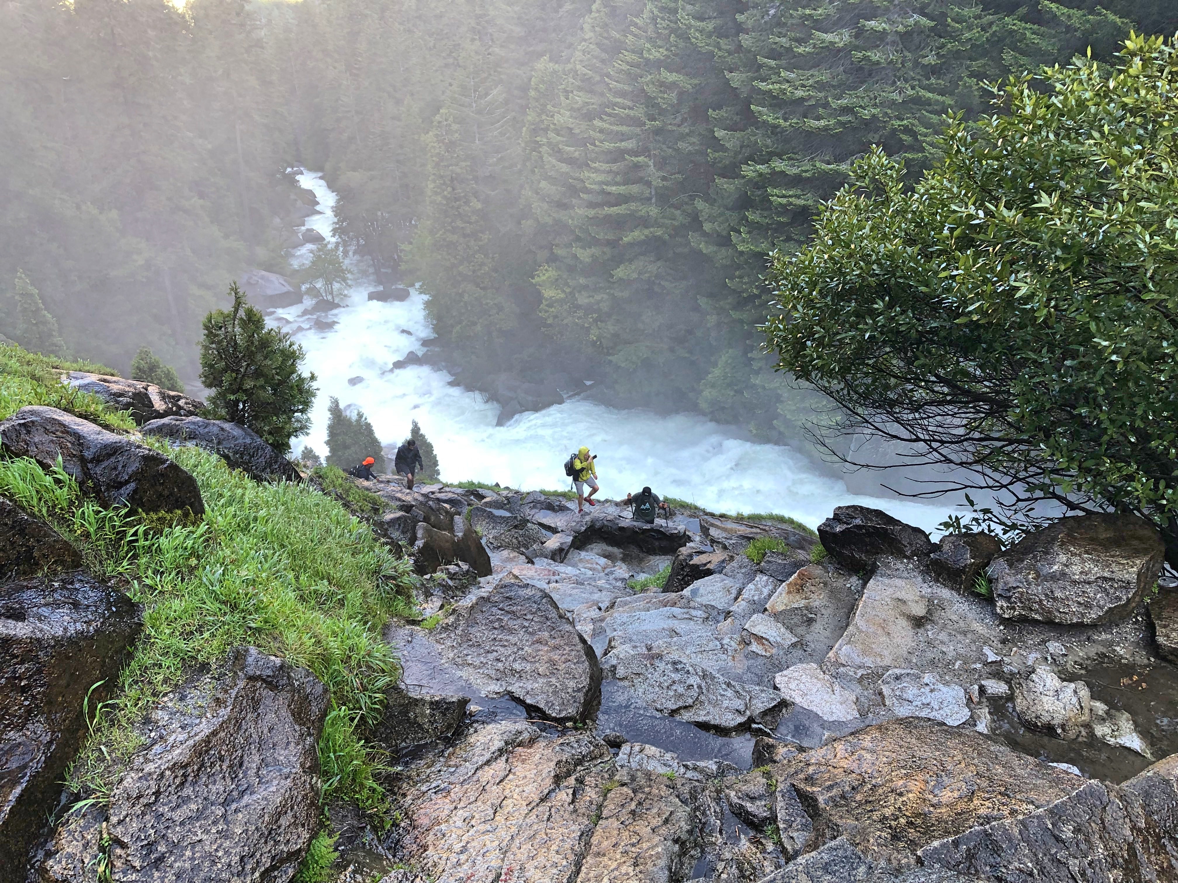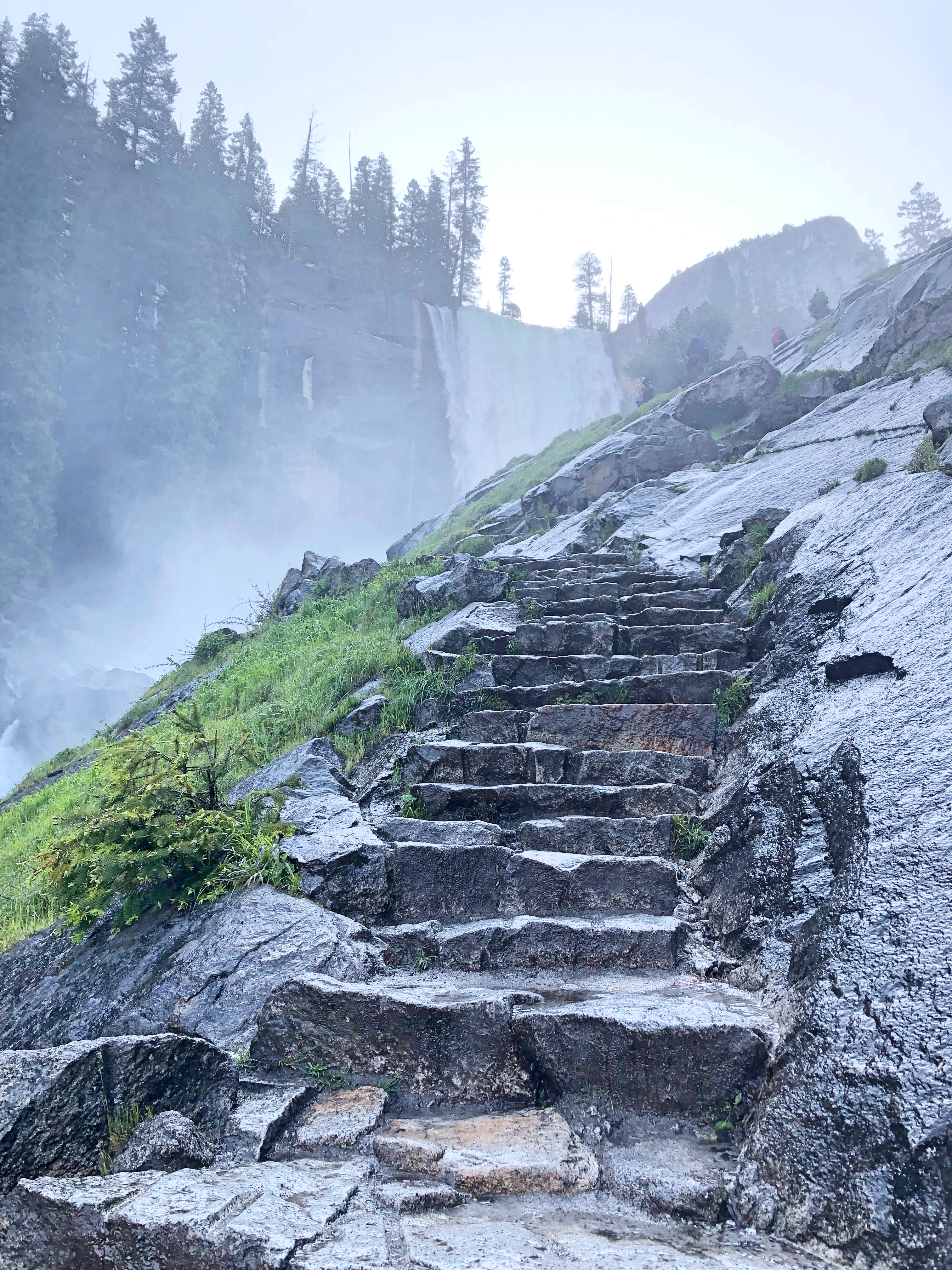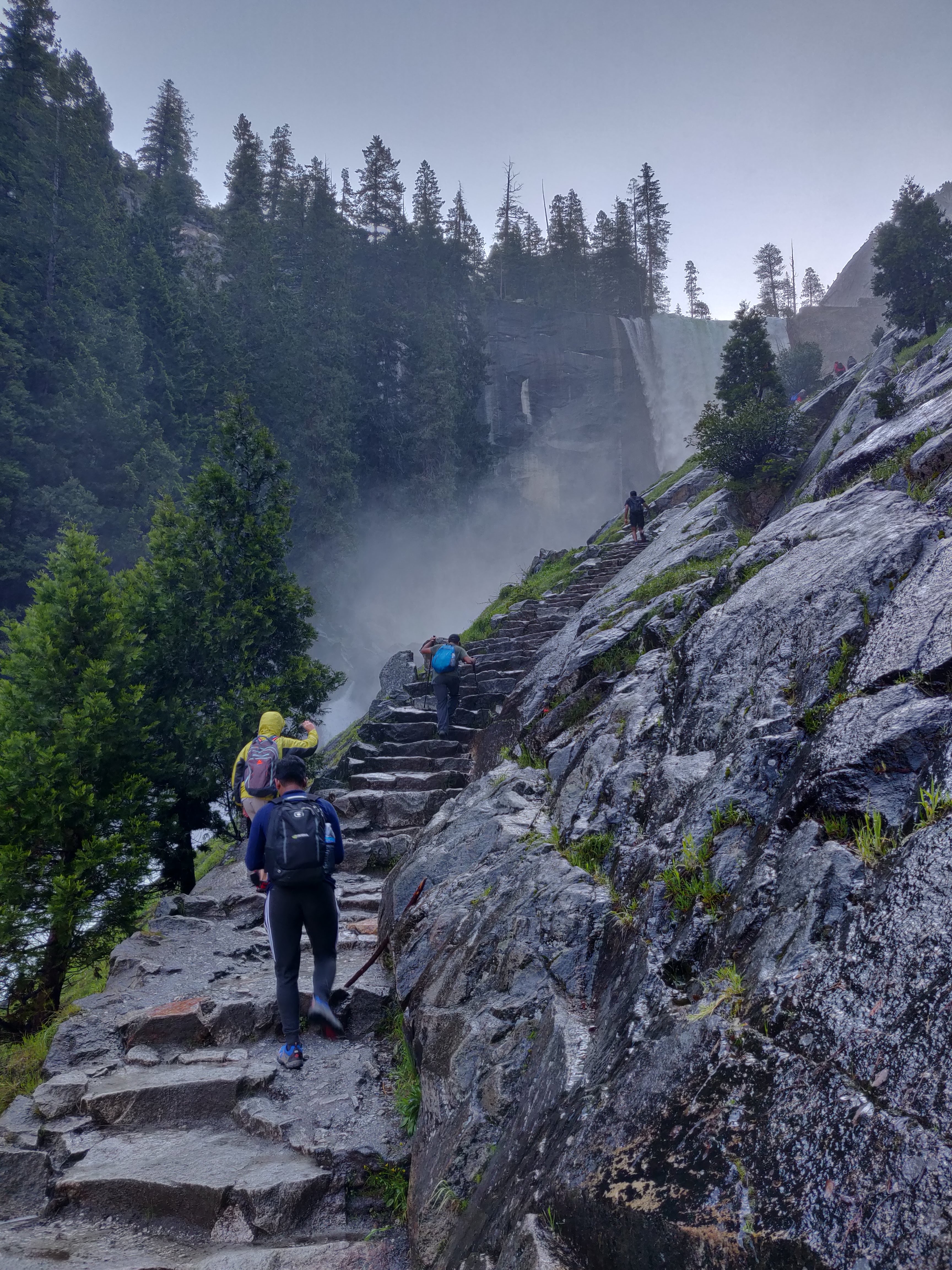 The first part of the hike is reaching Nevada Falls via Mist Trail which starts at Happy Isles trailhead. The trail starts with a steep incline right from the start and after half a mile of the hike is the Vernal Falls footbridge with a water tap. This is your last chance for purified drinking water on the hike so drink up and fill your bottles. After another mile begins the stairs to reach Vernal Falls. By the time we reached Vernal Falls, we were already drenched and realised why the name Mist trail. The mist from the waterfall is so strong that it feels as if it’s raining and we got completely soaked. It’s not even possible to take a photo without wiping the lens.