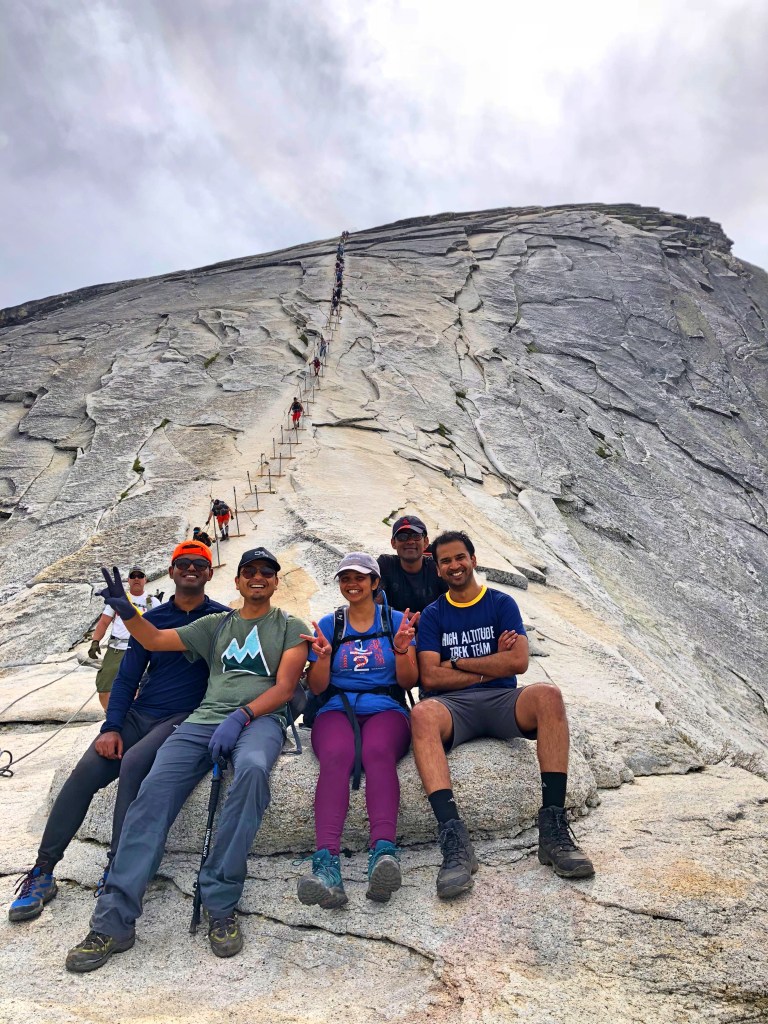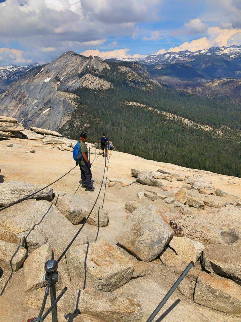 The trail after Vernal Falls goes flat in Little Yosemite Valley for around a mile, this is the only part of the trail which is flat. Then the trail spans through the forest of Sequoia trees. We thought this part would be easy but the whole 3-mile section has a constant slope and after already hiking for 5 miles, this part soaks the energy out of you. As you start to exit the forest you will begin to see what all this work was for. At the end of the forest, you get a view of Subdome, Clouds Rest and half dome. Just looking at the sheer size of half dome we were thinking how are we going to reach the top of Half Dome, it’s still so far! Before the entry of subdome permits are checked. Reaching to the top of subdome is a lot of effort in itself. By the time we reached the top of subdome, we were already wearied. Looking at the cables from here we were thinking did we really sign up for this! After some food and long break, we started our climb to Half Dome at around 1:30.