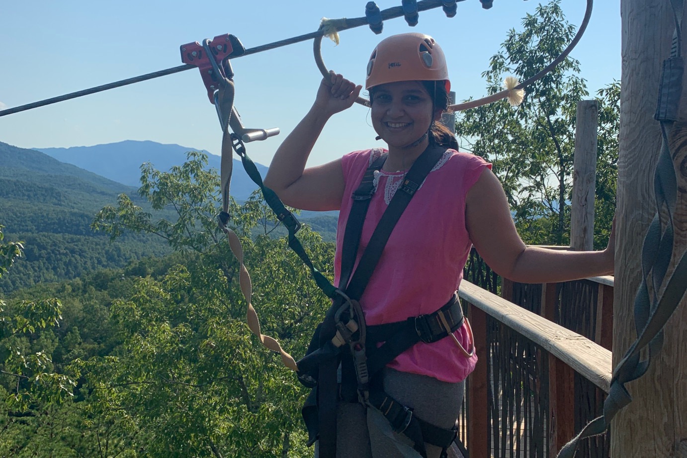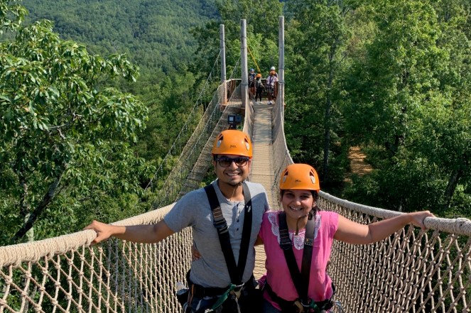 I love adventure sports, so when a friend of mine suggested doing ziplining in the Smoky Mountains, I was on board in a second. Mountaintop zipline tour was around 100$ per person which I thought was on costlier end but it was all worth it. There are several ziplining tours in Smoky, we did our tour with Climbworks Smoky Mountains. Our tour with Climb Works was a thrilling experience from beginning to end. Tour includes five side by side zips, four sky bridge and an ATV ride to the top.
