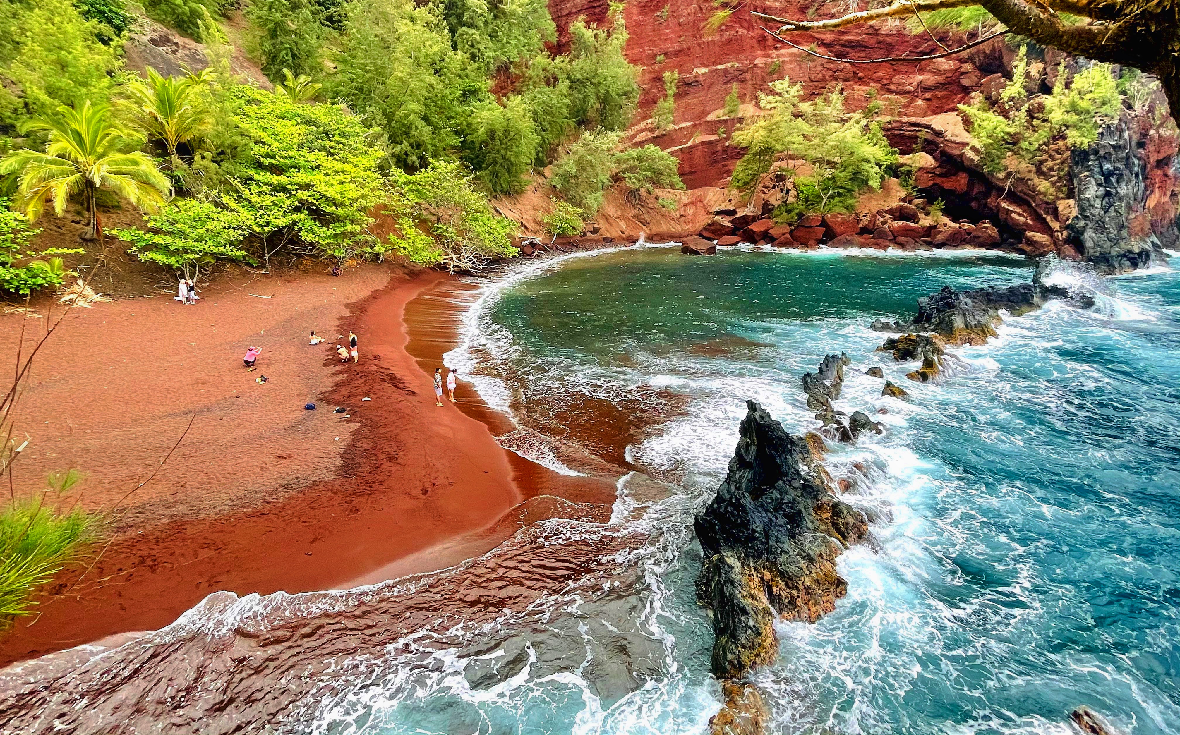 The red sand beach is within Hana. From the parking area, there is a short but steep trail to Red Sand Beach. With lava walls separating the cove from the ocean, Red Sand Beach is one of a kind. A trip to Red Sand Beach is another must-do on the Road to Hana.